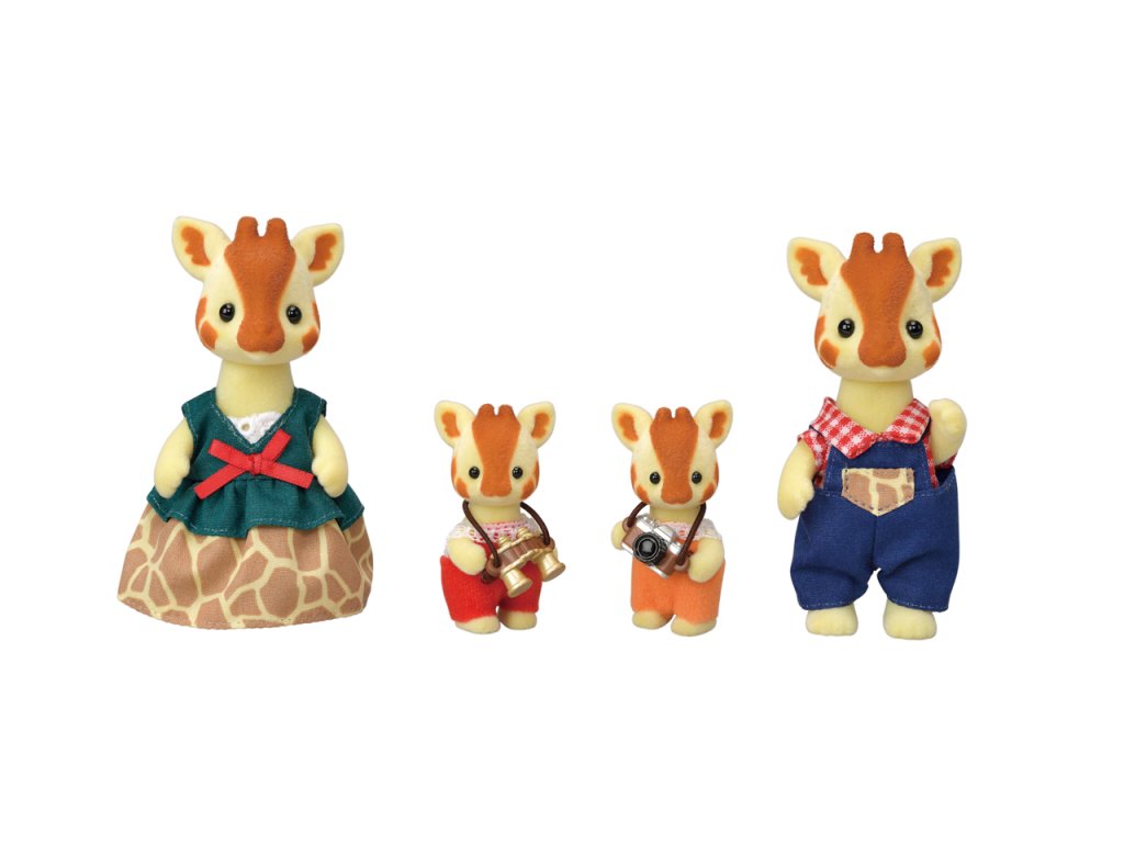A zsiráf család elbűvölő figurák, hosszú nyakkal és jellegzetes szőrzetmintával. A készlet négy figurát tartalmaz: Egbert apát, Olive anyát, valamint Bran és Brie babákat. Tartalmaz egy fényképezőgépet és távcsövet a babáknak. Egbert, a zsiráf apa mindig elfelejti, milyen magas, ezért állandóan beveri a fejét a dolgokba. Olive anya nagyon kecsesen jár. Bran, az narancssárga nadrágjában, imád apja fényképezőgépével fotózni. Igazán felnéz magas apjára. Brie, a piros nadrágjában, szeretné használni a távcsövet, amit szintén az apjától kapott. Folyamatosan azt kéri anyjától, hogy üljön a fejére, hogy még messzebbre lásson. Kombináld más házakkal és bútorokkal (külön megvásárolhatók) a még szórakoztatóbb és ötletesebb játék érdekében. A figurák kezei és lábai mozgathatók, csakúgy, mint a feje. Serkentik a gyermekek fantáziadús szerepjátékát. Életkor: 3+